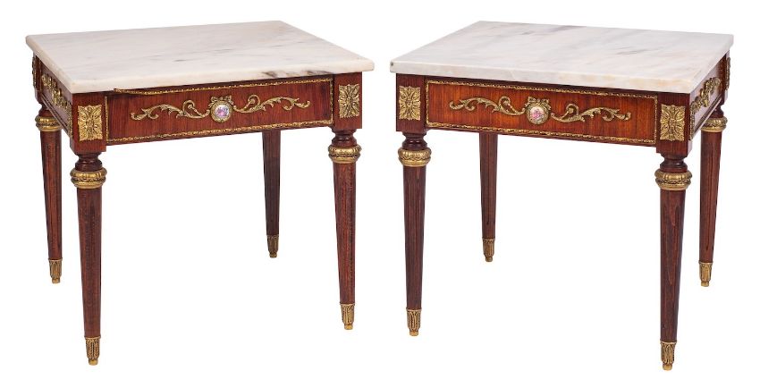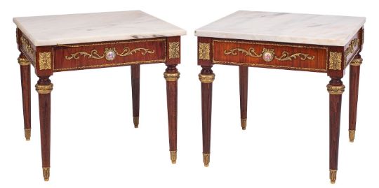 A pair of marble-topped mahogany occasional tables in French 18th century taste, modern; the square tops above inset ceramic and gilt metal scroll decoration to the frieze; the corners with acanthus panel mounts, on gilt metal mounted tapering legs; each approximately 48cm high, 50cm square