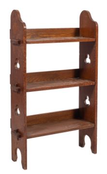 An oak open bookcase in Arts & Crafts style, probably for Liberty & Co., circa 1900; the sides with shaped tops and pierced trefoil motifs; flanking three shelves; 97cm high, 62cm wide, 21cm deep