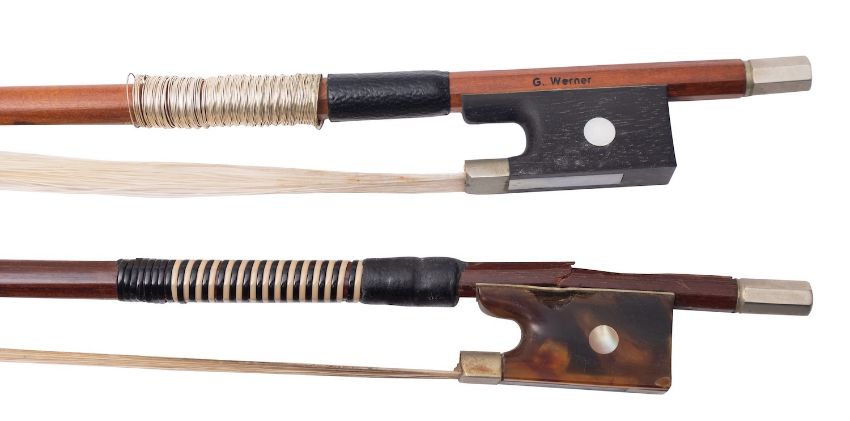 A German nickel mounted pernambuco viola bow, by G Werner, 20th century; the stick with ebony frog inlaid with mother-of-pearl, 74.5cm long; and another viola bow, unstamped, early 20th century. with tortoiseshell frog, (both with damages)