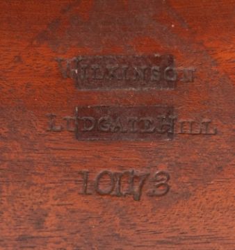 A Regency mahogany metamorphic occasional table /music stand, by Wilkinson of Ludgate Hill, early 19th century; the crossbanded top with rounded corners and twin inset brass sockets to take a shelf when the top is inverted as a stand, above a block with the adjustment mechanism on maker's stamp; on a telescopic stem rising from a spiral lobed shaft to a triform base, on three metal paw feet; 79cm high as a table, 46cm wide, 36cm deep