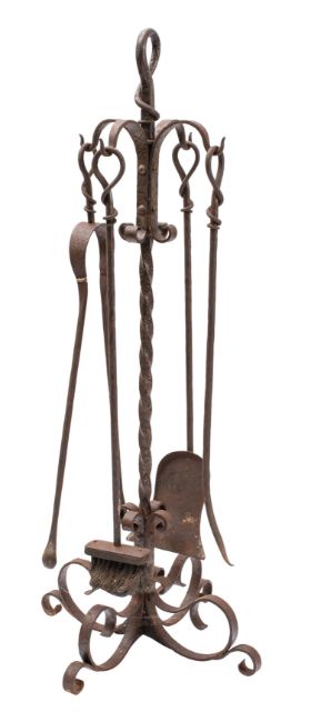 A wrought iron fire tool companion stand, 20th century; the shovel, poker, tongs and hearth brush all with looped grips, hung from outscrolled hooks around a writhen shaft, with conforming finial and openwork cruciform scrollwork base; 99cm high overall