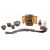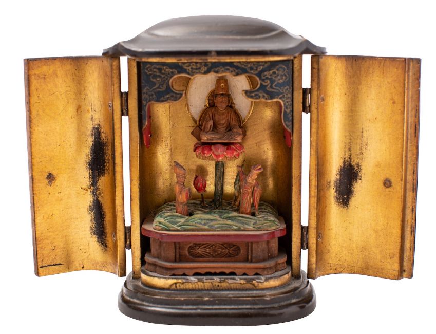 A mixed lot of Japanese and Chinese works of art comprising a black lacquer and m.o.p. ruyi sceptre, 40cm; a small shrine, 11cm; a hardstone snuff bottle; an interior painted snuff bottle [rim chip]; and four small pewter mounted wood cups.