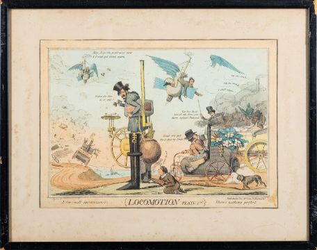 Robert Seymour (British, 1798 - 1836)Locomotion and Locomotion Plate 2nd, ca. 1827Two coloured etchings Each 25 x 35cm Each cut within the plate-mark, within the wash borders and laid on card