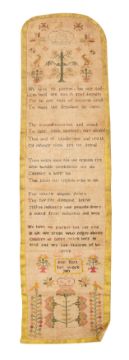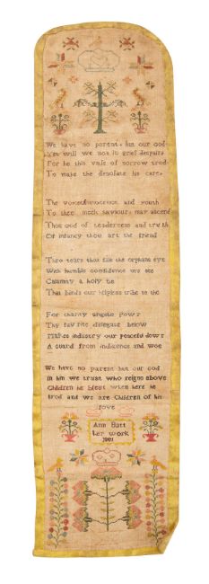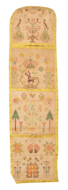 A fine George III double-sided needlepoint sampler, the work of Ann Batt,1801; one side with religious verse beneath a tree, flowers and birds, the name, date and further flowers and birds below; the reverse with four panels, the lower three forming pockets, all with conforming decorative motifs; 34.5cm long, 10cm wide
