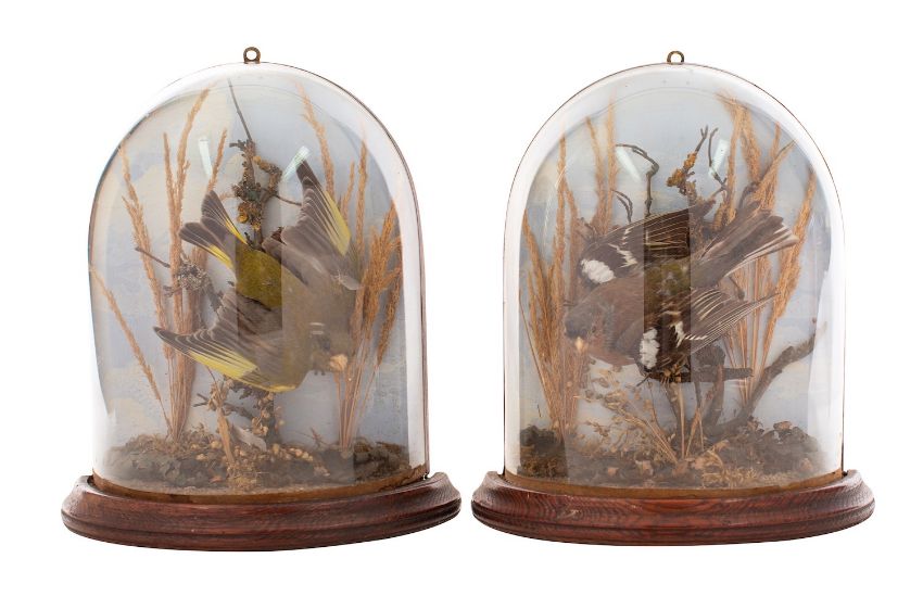Taxidermy, a preserved and mounted chaffinch and a similarly displayed green finch, late 19th century; both with flat-backed glass domes and moulded wood bases; 24cm high, 22cm wide