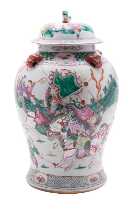 A Chinese famille rose baluster jar and cover with lion dog finial and handles, painted with a continuous battle scene between diaper and lattice borders, late Qing Dynasty, 42cm [interior crack].