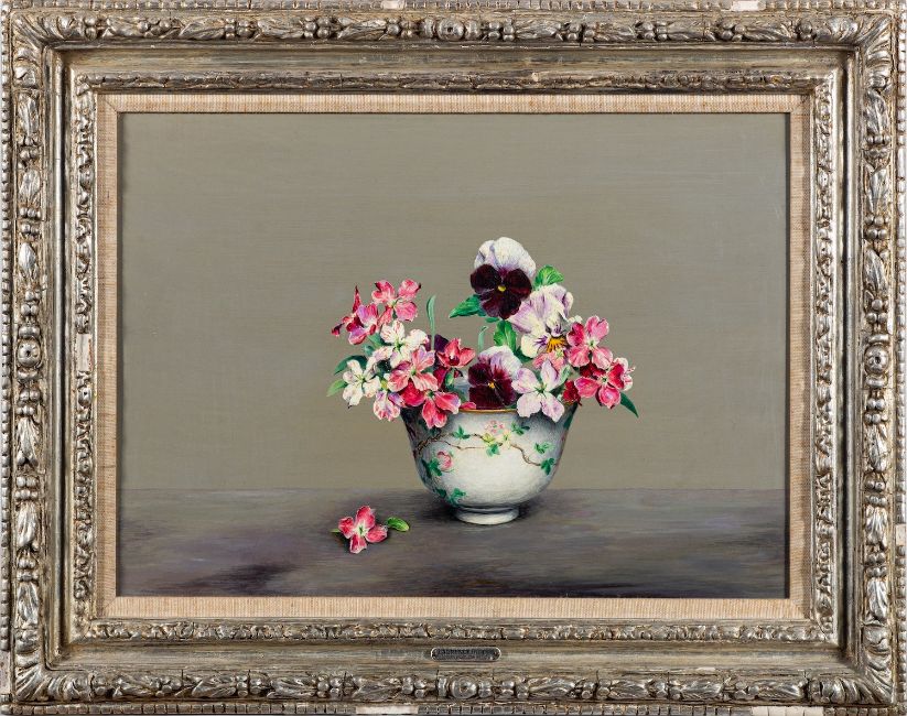 *Laurence Biddle (British, 1888-1968)Still life of stocks and Pansies in a decorated porcelain vaseOil on panel27 x 37cmProvenance: Polak Gallery, London 1979