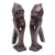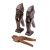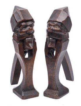 A Continental chip carved fruitwood mortice nutcracker, early 19th century, 19cm long; and a pair of Bavarian carved and stained wood nutcrackers modelled as gnomes, circa 1900: each wearing a pointed hat above inset glass eyes, an upturned nose and a pointed beard, 23cm high..