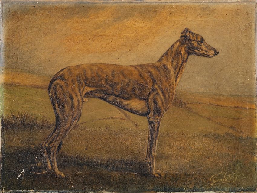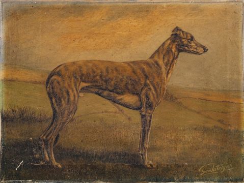 British School, 19th CenturyA greyhound in a landscapeOil on canvas30 x 40 cmIndistinctly signed lower right