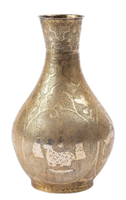 A Chinese gilded white metal vase engraved with deer, pheasant, other birds and foliage on a stippled ground, the underside with a mythical beast, 15cm.