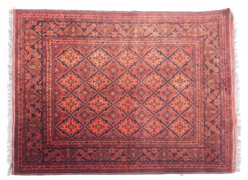 A Turkoman rug, the shaded wine and rose shaped lozenge panelled field with geometric hooked lozenge motifs, enclosed by a main shaded leaf and flowerhead meander border, 202cm x 155cm.