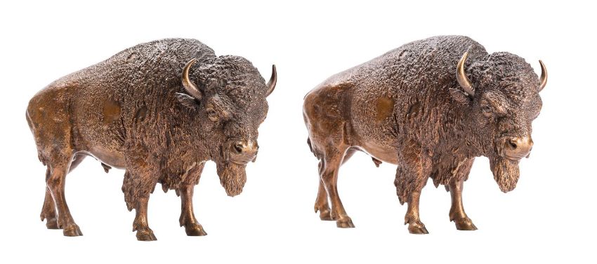 A pair of fine Viennese bronze models of buffalo, by Franz Bergman, circa 1900; naturalistically portrayed, standing four square with heads lowered; one stamped ...CHUTZT to the underside; 19cm high, 29cm longNote: See Shapiro Auctions, New York, Important Fine Art and Antiques, 22nd March 2020, lot 658, for an identical example, in that case bearing the 'B' in urn stamp for Bergman, as well as the GESCHUTZT patent stamp