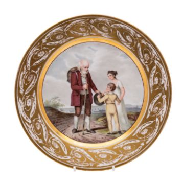 A Paris porcelain plate painted with a young boy and a girl engaging with a traveller on a track, a town beyond, the rim gilded with scrolling leaves and flowers, early 19th century, 23cm.