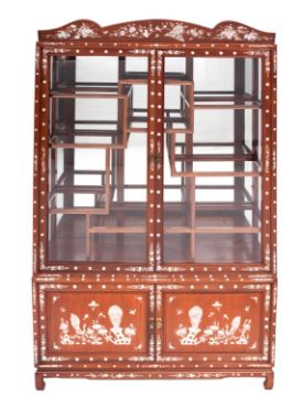 A South East Asian hardwood, mother-of-pearl inset and glazed display cabinet, 20th century; with floral and foliate motifs inlaid overall; the cornice above twin glazed doors opening to an arrangement of mirror backed openwork shelves with glass bases; the sides also glazed: the lower section with twin doors inlaid with mother-of-pearl birds and flowers; on short in-turned feet; 198cm high, 127cm wide, 38cm deep