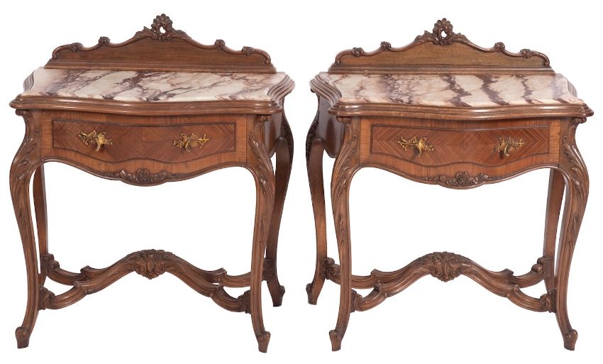 A pair of walnut, kingwood and marble mounted bedside stands in Louis XV taste, early 20th century; each with a raised back with serpentine and foliate carved upper edge; the white and purple veined marble tops within moulded edges; the serpentine fronts each with a quarter veneered drawer with foliate cast gilt metal handles; on foliate carved cabriole legs, each with cruciform stretchers; 77cm high, 69cm wide, 38cm deep
