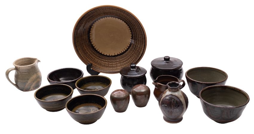 A quantity of Shepherds Well stoneware, by David and Simon Eeles, comprising six bowls, two jars and covers, a vase and two piece cruet, decorated variously, impressed personal seals, together with a Goldstone jug, one other and a combed slipware bowl.
