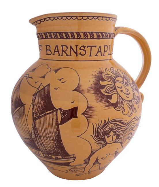 Harry Juniper [Contemporary] a slipware jug, 'The Result of Barnstaple' sgraffito decorated with a sailing vessel flanked by the sun, wind, a mariners compass and mermaid, signed below the handle, 22cm high.