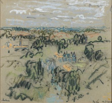 *Paul Ayshford Methuen (British, 1886-1974)Landscape with a house and a building with towerCharcoal and coloured chalks20 x 21.5cmSigned lower left and inscribed lower right and dated 14.8 1954