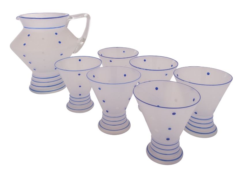 An Art Deco glass lemonade set, the frosted body with blue linear and spotted decoration, comprising a jug and six glasses.