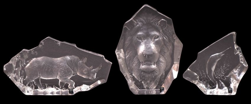 Three Mats Jonasson clear glass paperweights, each intaglio decorated with a lion, rhino and a marlin.