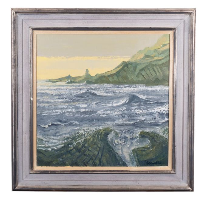 *Alan Cotton (British b. 1936) Hartland, Stormy Seas at Pulpit RockOil on canvas51 x 51cmSigned lower rightProvenance; Messum's, London