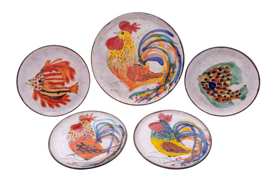 Five Le Brescon [Vallaruris] pottery plates, comprising one large and four smaller each decorated with either fish or a cockerel, incised marks to base, largest 34cm diameter.