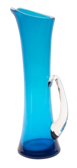 Frank Thrower for Dartington, a blue glass ewer, of slender waisted form with applied clear glass handle, 36cm high.