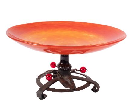 A Schneider Art Deco orange glass comport, set on a waisted black and clear striped stem set on a patinated metal scroll and foliate base with applied glass berries, 34cm diameter.