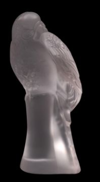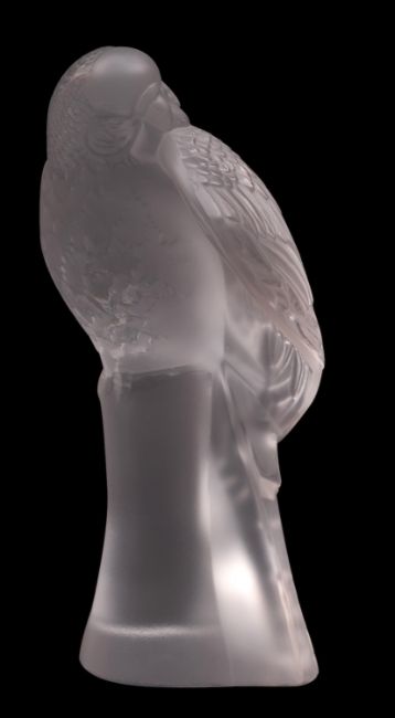 A Lalique Cristal figure 'Perruches', diamond point etched Lalique France, 15cm high.