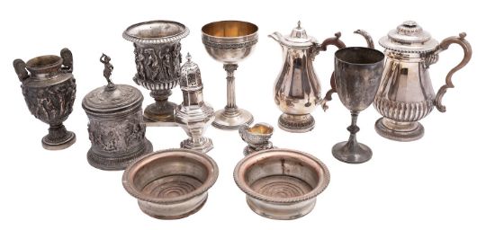 A group of 19th century silver plate including an Old Sheffield plate campagna urn stamped H&A 68, a lidded tobacco jar, a volute krater, a hot water jug, a coffee pot, two E.P.N.S chalices, a Rococo style dolphin and shell salt by P.T&Co, a pair of wine coasters and a sugar shaker, (11)