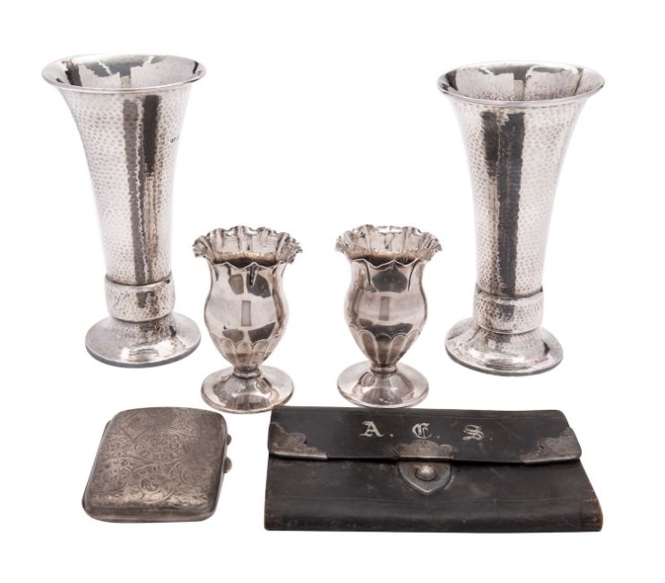 A pair of Arts and Crafts style silver vases by A. E. Jones (Albert Edward Jones), Birmingham 1924, trumpet shaped and hammered overall, 156.5cm (6 1/2in) high, loaded; a small pair of vases by Page, Keen & Page of Plymouth, London 1900, 9cm (3 1/2in) high; a scroll engraved cigarette case by Joseph Gloster Ltd, Birmingham 1927; and a late Victorian silver mounted leather wallet, London 1892, initialled, 15cm (6in) long, 177g (5.7 oz) weighable (6)