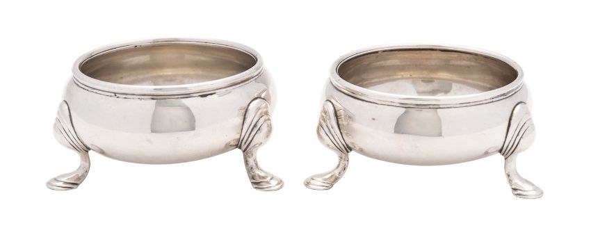 A pair of George II Scottish silver cauldron salt cellars by James Welsh, Edinburgh 1759, with shaped gadrooned rims and each on three stepped pad feet, 7cm (2 3/4in) diameter, 187g (6 oz)