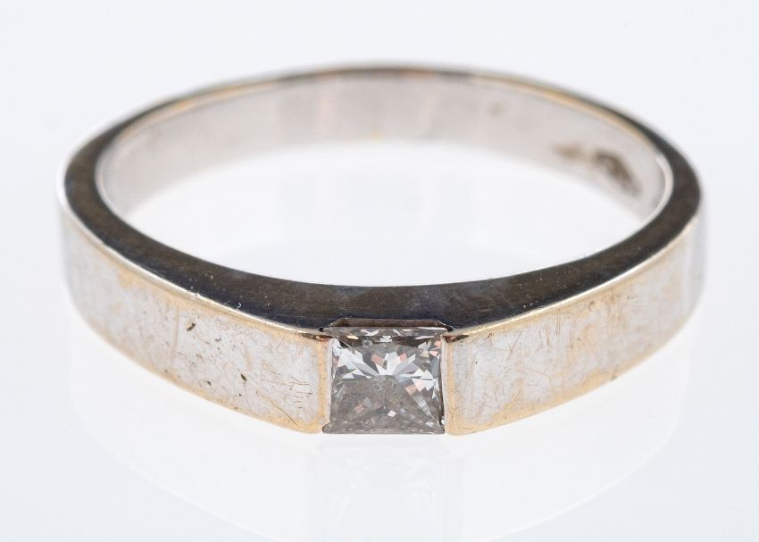 A contemporary white gold ring set with princess cut diamond of 0.25 carat, 18ct, ring size L.weight 3.6 grams