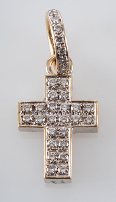 A diamond set crucifix pendant, total estimated diamond weight ca. 0.40ct, with Italian control marks for 18ct gold, total length (inc jump ring) ca. 2.8cm, total weight ca. 6.3gms, accompanied by pouch.