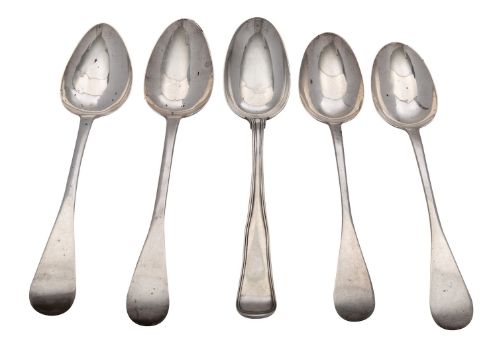 A pair of George IV silver Old English pattern table spoons by David Phillips, London 1836; another pair similar by John, Henry & Charles Lias and a Danish tablespoon, stamped J.Holm, 270g, (8.6 oz) gross (5)