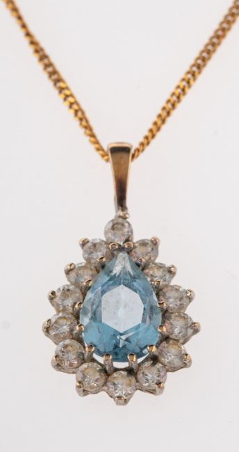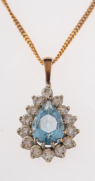 An aquamarine and diamond pendant, the pear cut aquamarine claw set within a surround of brilliant cut diamonds, on a curb link chain, stamped 9kt, pendant 2cm long