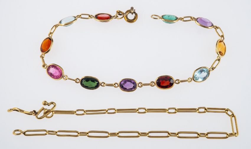 both 18 cm long, multi stone bracelet has a replacement bolt ring, gross weight 8.7 grams