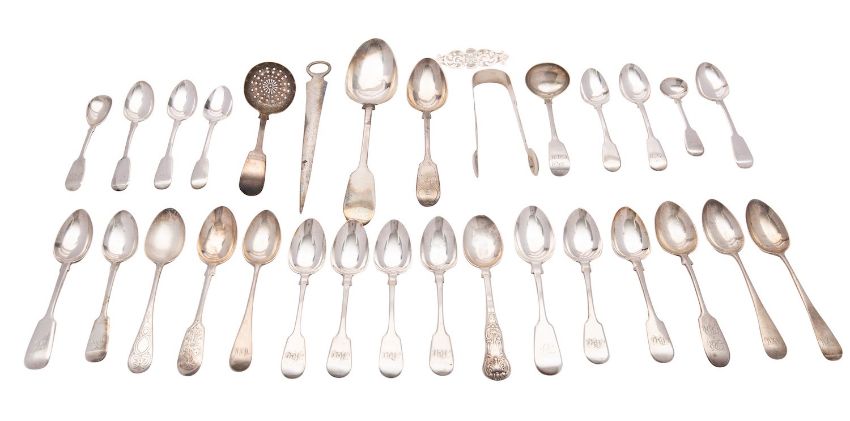 A collection of Exeter silver flatware, various 19th century makers, mainly initialled, all but one spoons, including: a meat skewer by Joseph Hicks, 1817; six Fiddle pattern teaspoons by Edward Osment, 1857; five Fiddle teaspoons by W. R. Sobey, 1835; a Fiddle sugar tongs by Josiah Williams & Co., 1854; a sugar sifting spoon; a Fiddle small sauce ladle; etc.; and a scroll engraved brooch by John Osment, 1848, 667g (21.45 oz) gross (30)