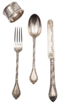 A Victorian silver four-piece christening set by Holland, Son & Slater, London 1883, the knife with a loaded handle, uninscribed, 103g (3.3 oz) weighable, in a leather covered case