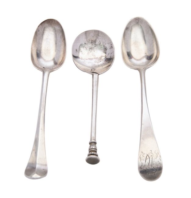 A Charles I silver Seal Top spoon by Edward Hole, London 1632; a George I Hanoverian pattern tablespoon, possibly by John Jones, London 1717, Britianna standard; and an Old English pattern tablespoon by Thomas and William Chawner, London 1764 or 1766 (compressed), 185g (5.95 oz), gross, (3) Condition Report The seal top with crack in the bowl by the handle
