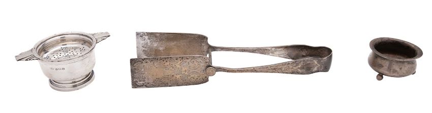 A silver pastry serving tongs by James Deakin & Sons, Sheffield 1910, engraved King's shape, 22cm (8 3/4in) long; an Art Deco tea stainer on stand by Mappin & Webb, Birmingham 1944; and a cauldron salt, Sheffield 1911, 252g (8.1 oz) gross (3)