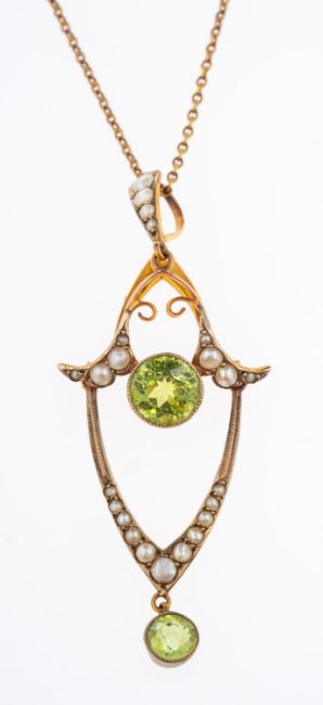 Good condition, gold stamped but marks unclear, central peridot 7mm, chain unmarked, gross weight 3.9 grams