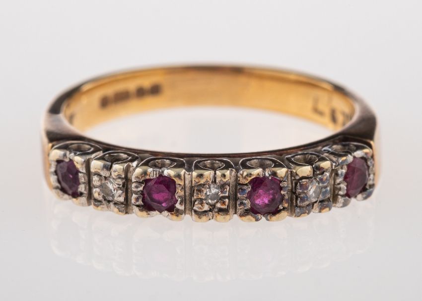 A ruby and diamond ring, half set with circular cut rubies and eight cut diamonds, stamped 375 for 9ct, with Birmingham hallmarks, ring size M.