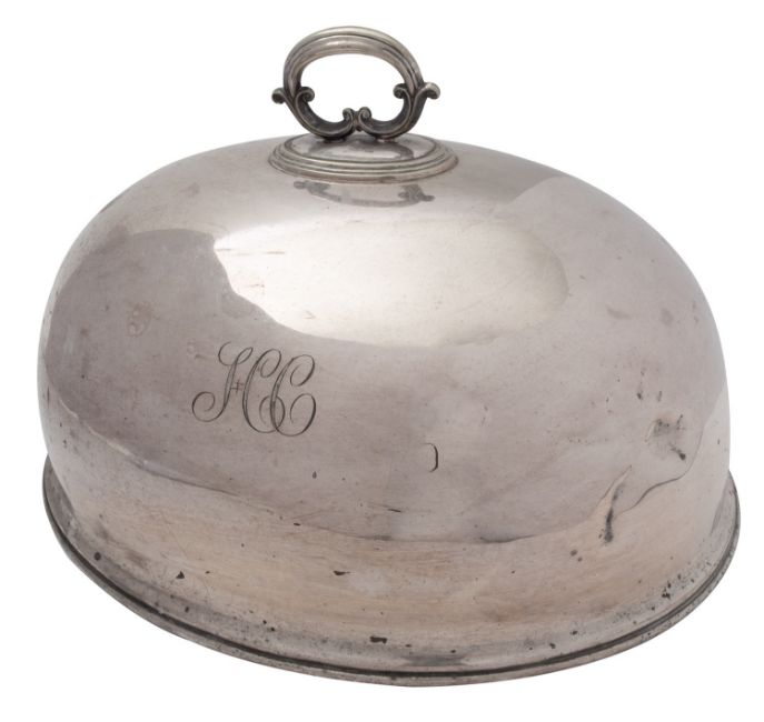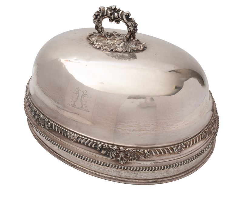 A large George IV Old Sheffield plated meat dome by Dan Holy, Parker & Co, Mulberry Street, Sheffield of oval form with detachable handle decorated with grapes and vine leaves, inset cartouche with engraved greyhound heads, 48.5 x 38cm (19 1/4 x 15in), together with three graduated E.P.N.S meat domes and another matching, (5)