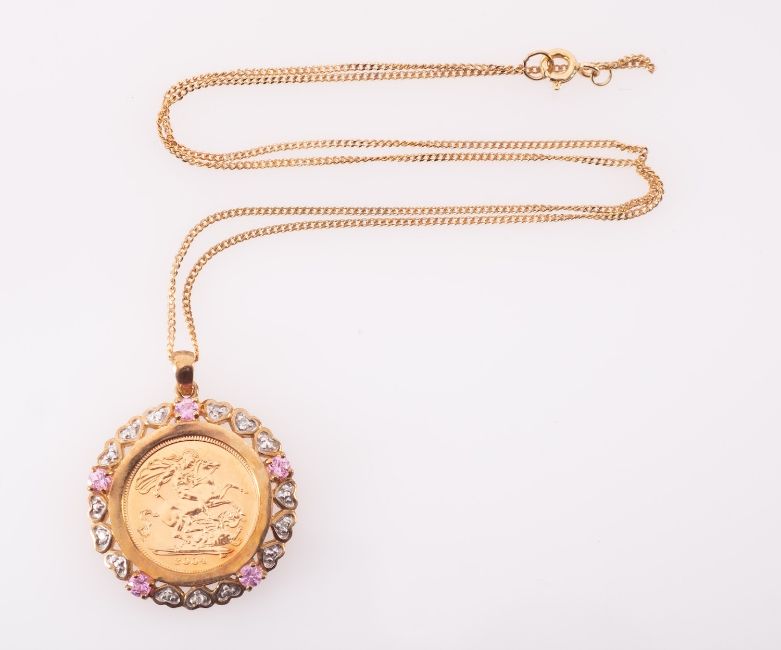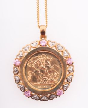 An Elizabeth II half sovereign coin in gold mount with heart form diamond settings and pink sapphires, on fine chain marked 9ct, Tower of London impressed box Condition Report Good condition, cased, gross weight 11.1 grams