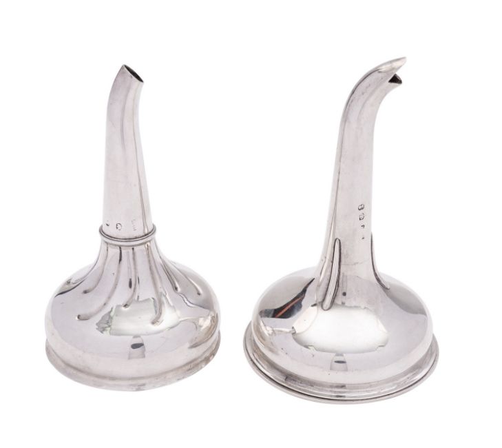 Two George III Scottish silver wine funnel spouts only, duty, thistle and worn maker's marks, together with a muslin ring, unmarked, 142g (4.55 oz) gross,(2)