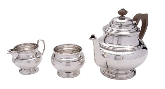 A silver three piece tea service by William Suckling Ltd, Birmingham 1930, baluster, the tea pot with a composition finial and handle, a domed cover moulded bands and a circular foot, 21.5cm (8 1/2in) long, 780g (25.05 oz) gross (3)