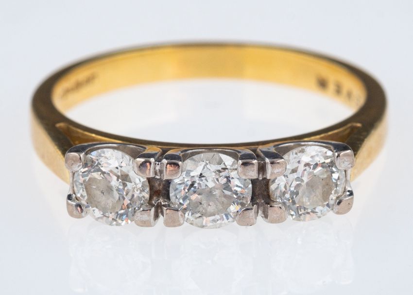 Three stone diamond ring, brilliant cut stones with a total carat weight of 1.02 carat set in 18ct white and yellow gold, ring size O-P, accompanied by an IGI certificate