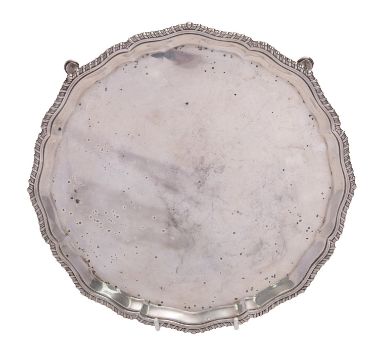 A silver salver by Harrods Ltd (Richard Woodman Burbridge), London 1933, shaped circular with a raised gadrooned rim, on four pad feet, uninscribed, 26cm (10in) diameter, 533g (17.15 oz)