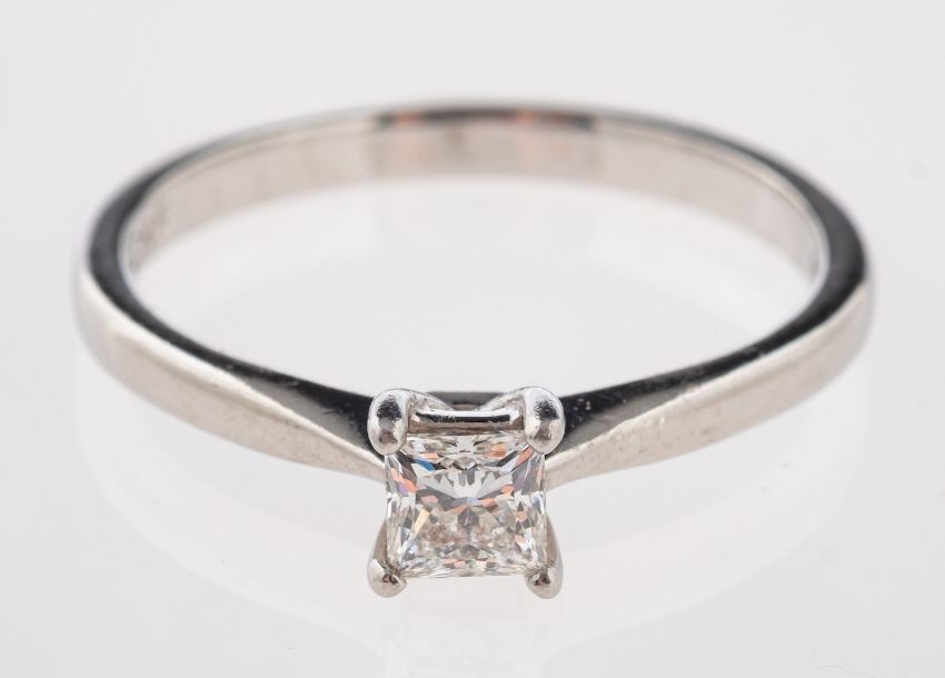 A platinum and diamond ring, the square cut diamond, estimated to weigh 0.25 carats, in a four claw setting, stamped 950 with full London hallmarks for 2013, ring size P 1/2 Condition Report The diamond assessed in setting as SI clarity. Colour assessed in setting as G/H,Overall good condition with general wear. Scuffs to the setting.